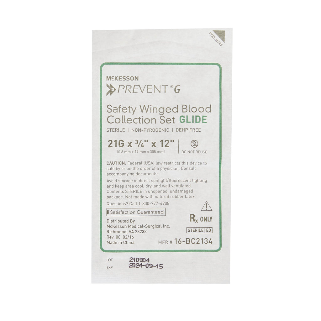 McKesson Prevent® G Blood Collection Set 21 Gauge 3/4 Inch Needle Length Safety Needle 12 Inch Tubing Sterile